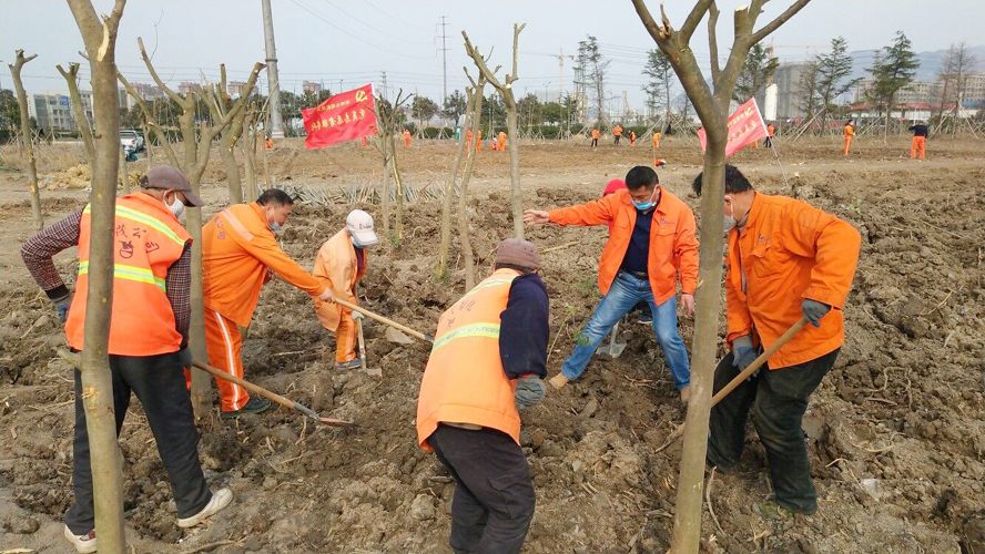 為保證植樹質(zhì)量,該公司配備多名專業(yè)技術(shù)人員進(jìn)行全程技術(shù)指導(dǎo)。上午8時許,在移苗現(xiàn)場,一臺挖掘機轟隆隆地作業(yè)著,小心翼翼的將一棵棵大樹苗連根拔起,在保證不擠壓的情況下,輕抬輕放,裝苗運輸。在栽苗活動現(xiàn)場,全體工作人員戴好頭罩、手套等防護(hù)用具,在統(tǒng)一指揮下,彼此間隔1米左右,擼起袖子、揮著鐵鍬、扛著鋤頭飛快地投入到栽苗植樹作業(yè)中。大家分工協(xié)作,有的開槽挖坑;有的栽植樹苗;有的抬木扶苗;有的回填新土;有的纏繩護(hù)樹;有的澆水保濕……到處都是忙碌的身影,整個植樹活動現(xiàn)場一片熱火朝天的繁忙景象。放眼望去,在明媚的春光中,一排排新栽下的樹苗迎風(fēng)挺立,生機勃勃,組成了一道道靚麗的風(fēng)景線。