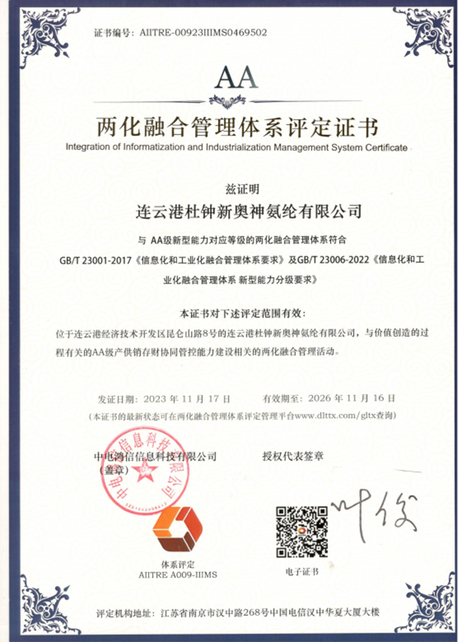 杜鐘氨綸公司于2023年11月17日取得了AA級兩化融合管理體系評定證書。該證書覆蓋了與價值創造的過程有關的AA級產供銷存財協同管控能力建設相關的兩化融合管理活動。