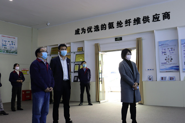 達晴一行人先后參觀了公司展廳、黨員活動室、八期生產線、自動化包裝線等。參觀過程中,講解員對氨綸公司的發展歷程,差別化產品、戰略優勢、等進行了詳細介紹。達晴副行長對氨綸公司低溫熱粘合氨綸、抗菌氨綸、驅蚊氨綸及氨綸生產全流程自動化、智能化生產線等給予了高度評價。希望氨綸公司進一步深入實施差別化氨綸及后道特色產品發展戰略的重大舉措,乘風破浪,再創行業輝煌。