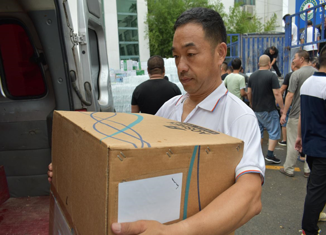 中午十二點,第一批物資捐贈后,顧不得吃飯我們就奔赴第二個捐贈點滎陽紅十字會。路上交警為我們耐心引導(dǎo),仔細說明哪里有塌方,哪里可以通行,臨行還貼心的留下微信號碼,囑咐道:在鄭州遇到困難隨時聯(lián)系。到達后不出意外的開始排隊,看著其他志愿者熱火朝天的忙碌,我和同行的小孫心里很不是滋味:我們千里迢迢帶著集團公司黨委和公司黨委的重托和港城人民的美好祝愿來到災(zāi)區(qū),我們不僅僅是要來捐贈物資,是不是也該做點什么?幾經(jīng)請示,紅會組織人員終于答應(yīng)了我們的請求,同意我們作為臨時志愿者加入搬運捐贈物資的隊伍。雖然大家已經(jīng)兩天沒合眼了,但是當(dāng)穿上志愿者馬甲后,我們頓時精神煥發(fā),立刻投入到緊張有序的搬運工作中。托舉起每一件來自祖國各地捐贈物資,心里都暖暖的,因為這里充滿了來自大江南北人們深深的祝福,激動的心情難以言表。此刻,我們對“眾志成城”有了更深刻的理解。