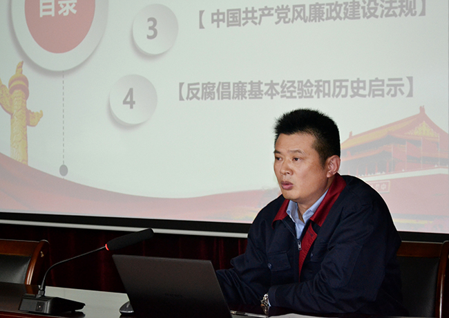 劉書記深入講解了廉政的含義、新中國反腐之路、中國共產黨黨風廉政建設法規、反腐倡廉基本經驗和歷史啟示,以大量典型案例,深刻剖析違紀違法根源,敲響廉政警鐘、強化規矩意識,筑牢不想腐的思想堤壩。要求廣大黨員干部在今后的工作和生活中要保持一顆清廉的心,干干凈凈做人,踏踏實實做事。