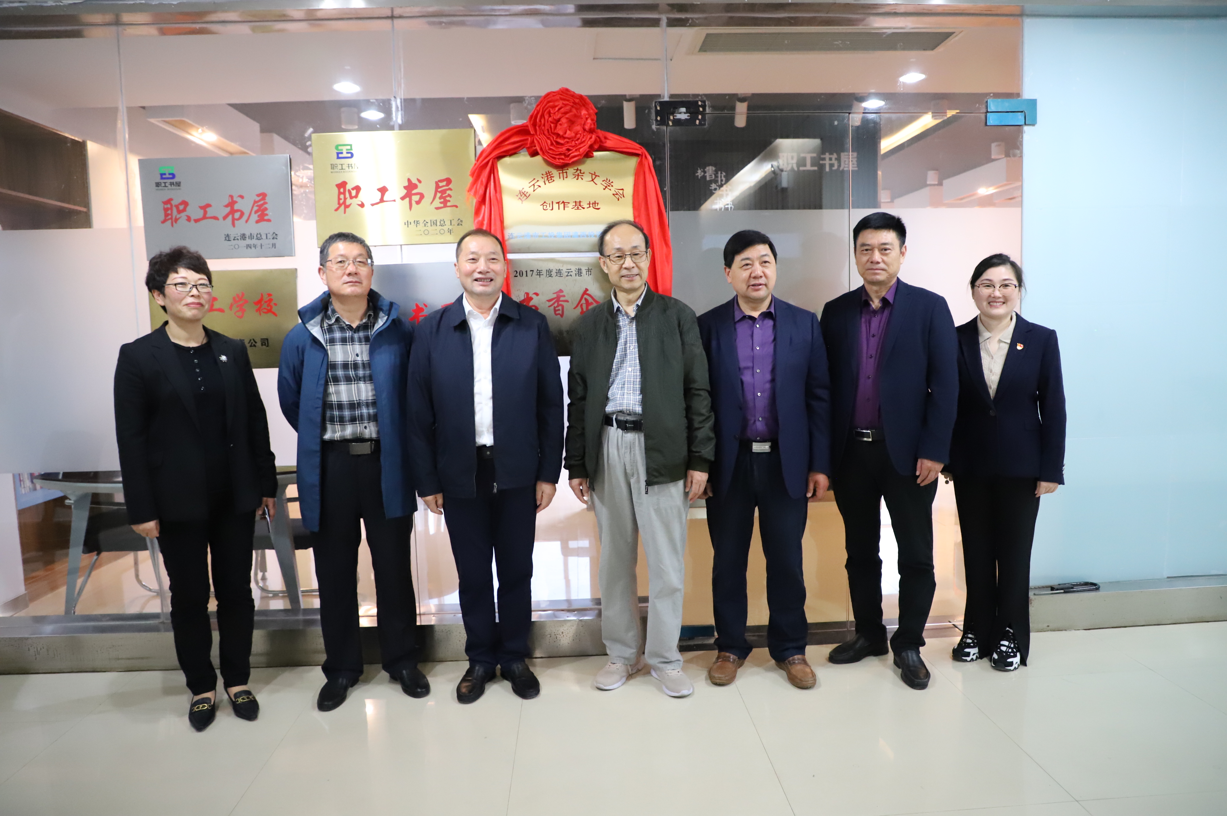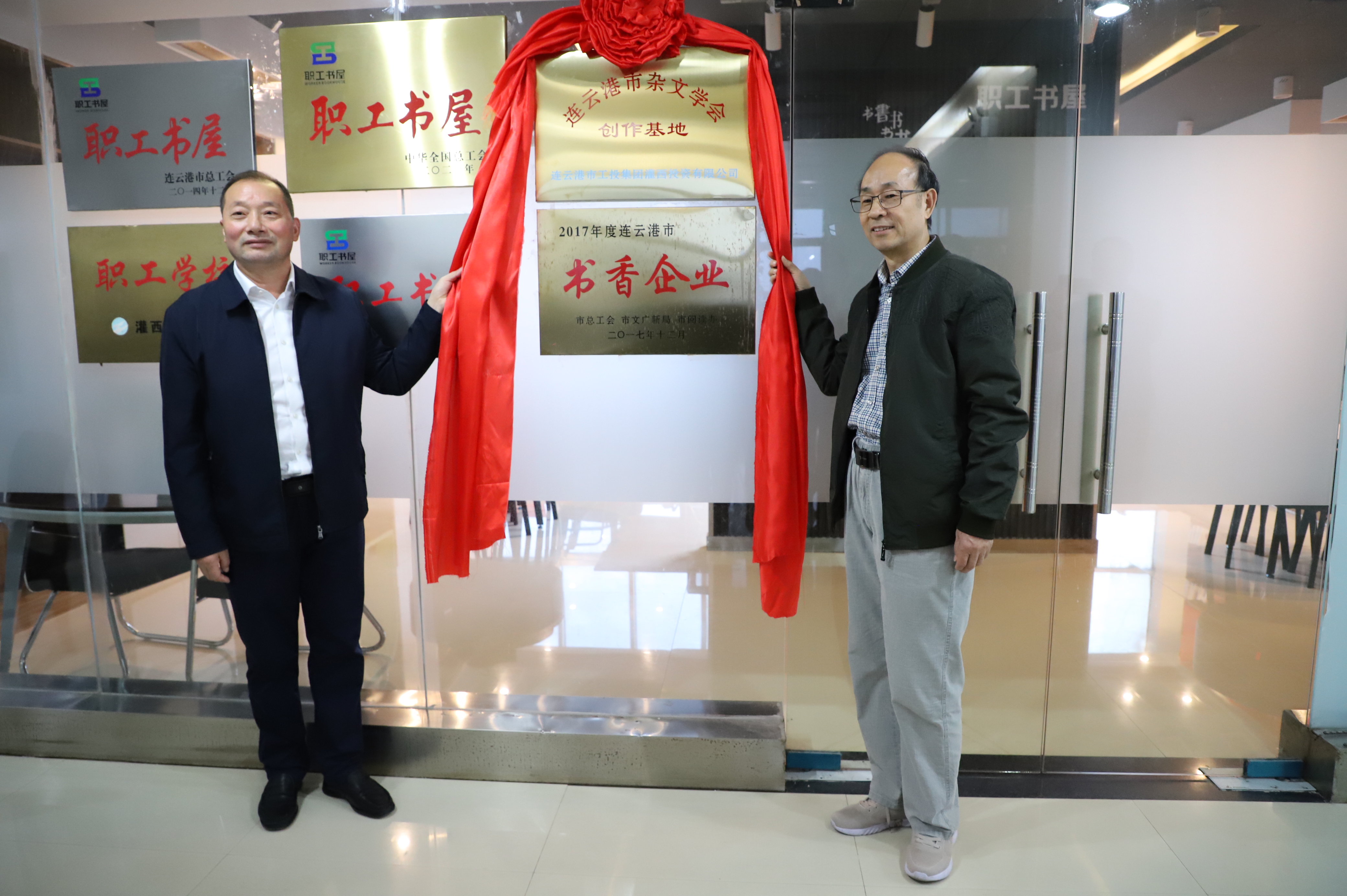 113日,連云港市雜文學會創作基地掛牌儀式在灌西投資公司職工書屋舉行,市雜文學會會長李正冬一行為灌西公司授牌,公司黨委書記、董事長、總經理李國文,黨委副書記、工會主席王宏等參加掛牌儀式。
