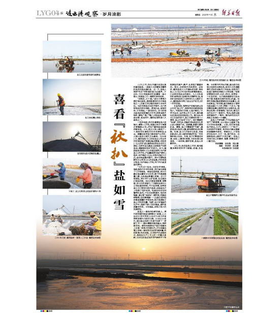 扒鹽現(xiàn)場(chǎng),指揮生產(chǎn)的程龍是土生土長(zhǎng)的“鹽三代”,爸爸和爺爺都是老鹽場(chǎng)人。“和鹽場(chǎng)打交道,心里才踏實(shí)。”大學(xué)畢業(yè)后,在外地工作了幾年,程龍最終還是決定回到鹽場(chǎng)工作。程龍說(shuō),純手工扒鹽的年代,鹽工們都很辛苦——春季,鹽工們迎來(lái)“大忙”。他們需要防“地漏”,用石拱、壓割機(jī)把池底壓實(shí),防止鹵水滲透下去。緊接著,就要忙春季扒鹽。夏季,鹽工們需要防“天漏”,提前將鹵水放進(jìn)土塘,避免降雨將鹵水稀釋。秋季,鹽工們開始手工扒鹽,用扁擔(dān)挑鹵水,用小推車把曬好的鹽一車車推到船上運(yùn)走。冬季,鹽工們需要對(duì)溝道、池埝、土塘進(jìn)行修復(fù),為來(lái)年春天做準(zhǔn)備。一年四季,循環(huán)往復(fù),鹽場(chǎng)人辛勤勞作。