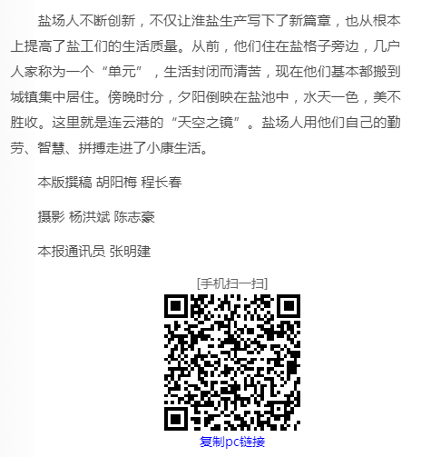 鹽場(chǎng)人不斷創(chuàng)新,不僅讓淮鹽生產(chǎn)寫下了新篇章,也從根本上提高了鹽工們的生活質(zhì)量。從前,他們住在鹽格子旁邊,幾戶人家稱為一個(gè)“單元”,生活封閉而清苦,現(xiàn)在他們基本都搬到城鎮(zhèn)集中居住。傍晚時(shí)分,夕陽(yáng)倒映在鹽池中,水天一色,美不勝收。這里就是連云港的“天空之鏡”。鹽場(chǎng)人用他們自己的勤勞、智慧、拼搏走進(jìn)了小康生活。
