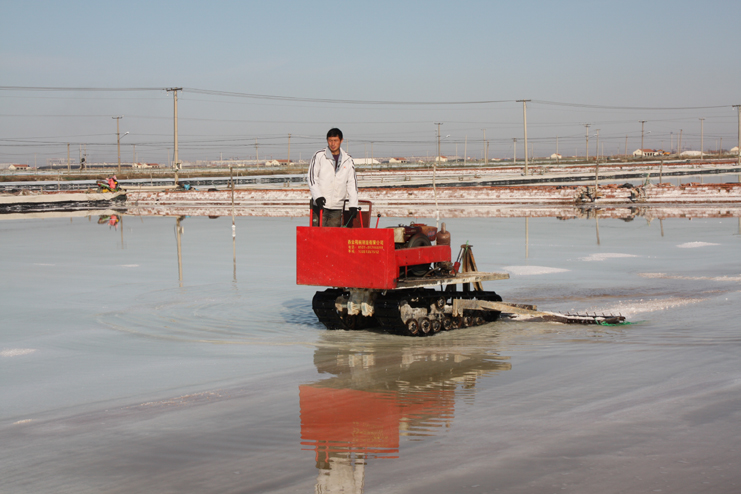 在埒南制鹽分公司的八班,我們看到一名工人正熟練操作著一臺整平機械在結晶池內來回移動,對扒過鹽的格塊進行整平,還有幾名工人用鐵锨整平機械到不了的邊角地帶。由于在廩基上沒有看到鹽,而結晶池已扒過鹽,我們覺得奇怪,經了解,原來今年新扒鹽已經有部分銷售了出去。埒南制鹽分公司經理楊守兵正在九班的灘上查看機械破碴情況,他說道:“我們以委員包片形式深入班組貫徹公司職代會精神,加強形勢任務宣傳統一思想,讓員工認識到當前原鹽市場回暖行情,鼓舞士氣,振奮精神,全力投入到當前春季生產中來。”