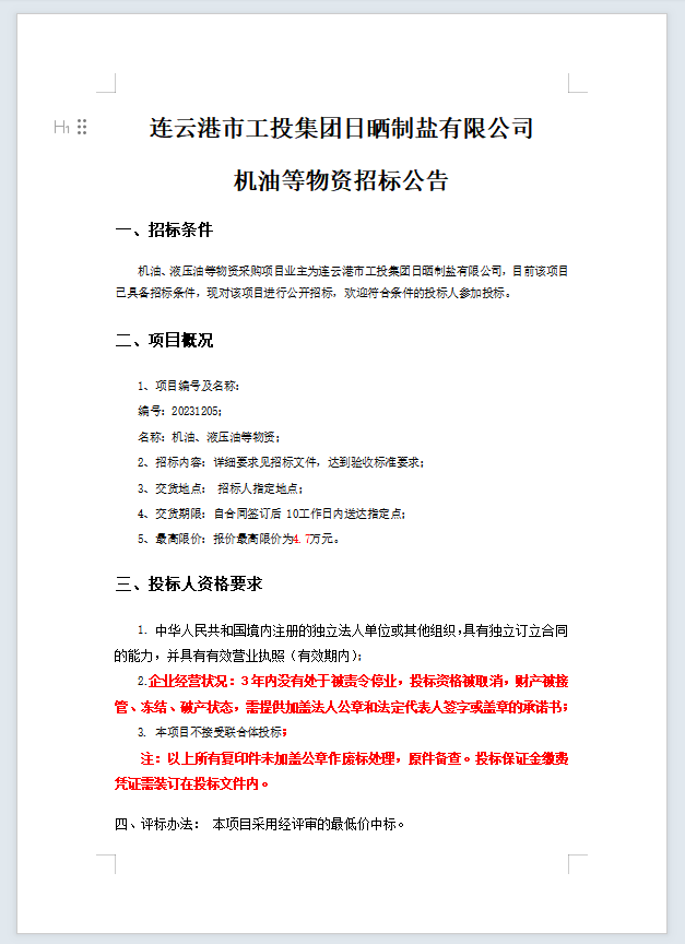 連云港市工投集團(tuán)日曬制鹽有限公司機(jī)油等物資招標(biāo)公告