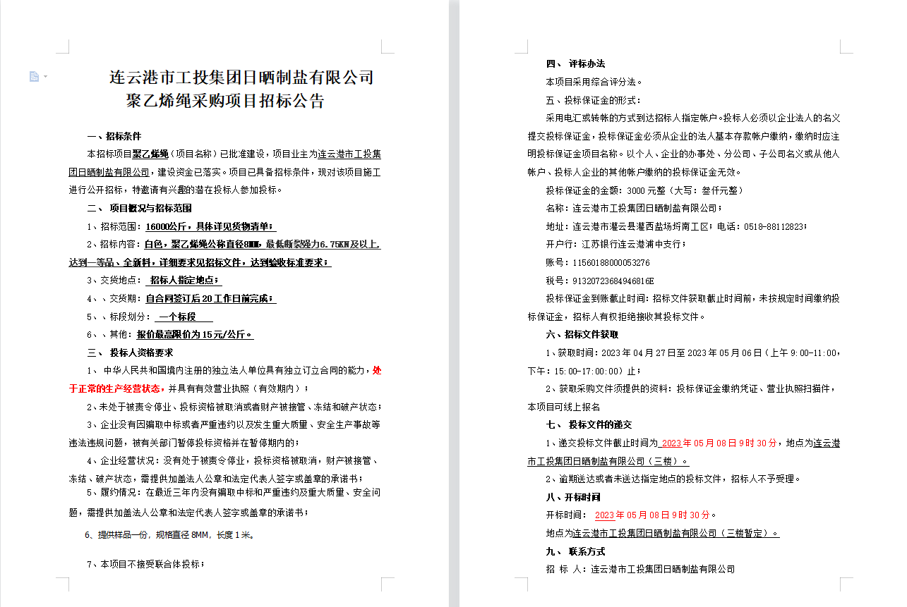 連云港市工投集團(tuán)日曬制鹽有限公司聚乙烯繩采購項(xiàng)目招標(biāo)公告