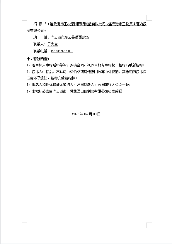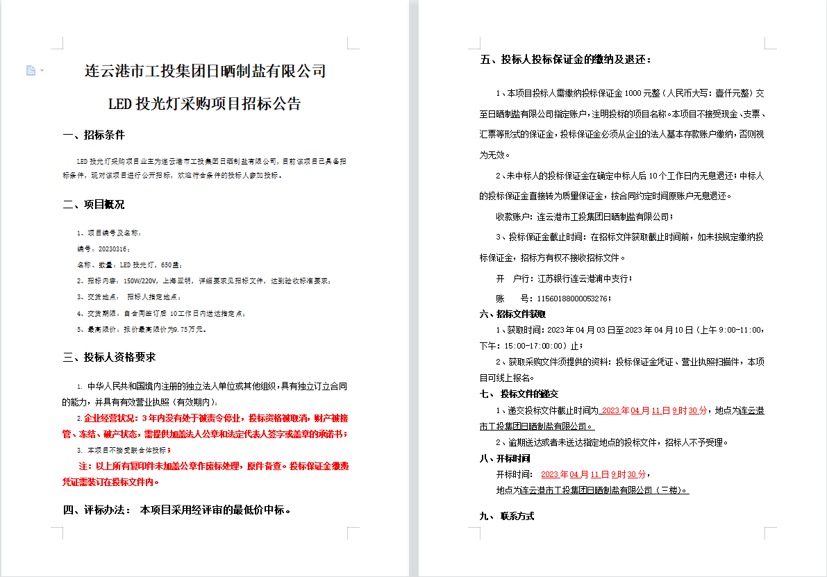 連云港市工投集團日曬制鹽有限公司LED投光燈采購項目招標公告