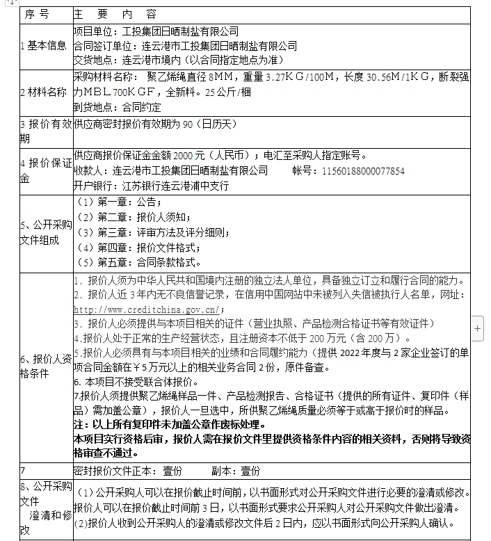 連云港市工投集團日曬制鹽有限公司聚乙烯繩采購項目