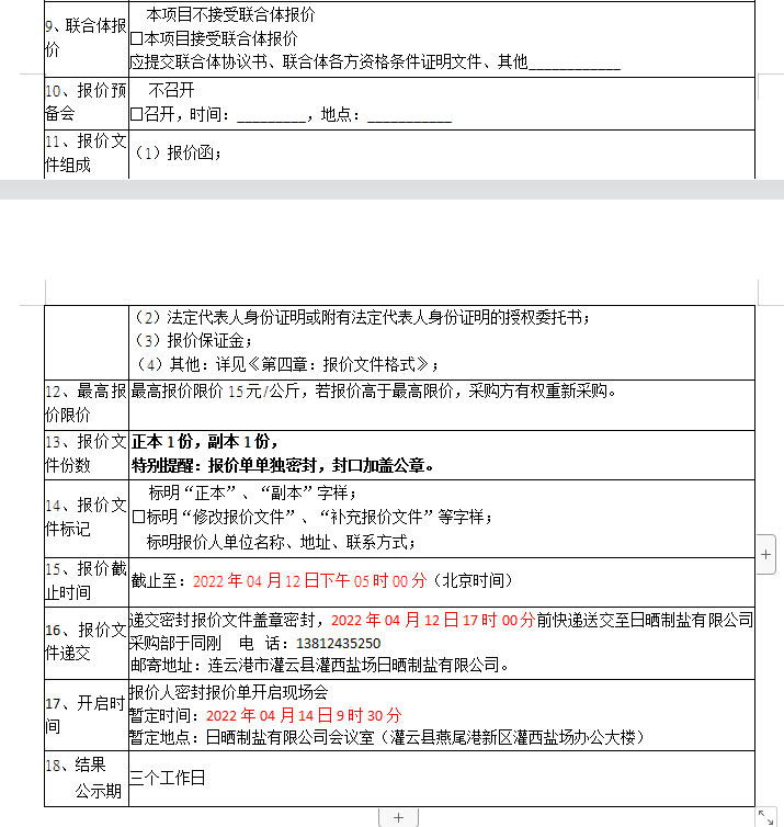 報價保證金接收人:連云港市工投集團日曬制鹽有限公司。