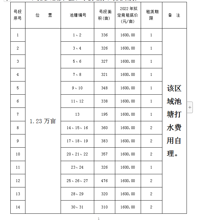 一年期內的池塘租賃價格按獲得池塘承租權的競租方報價執行。