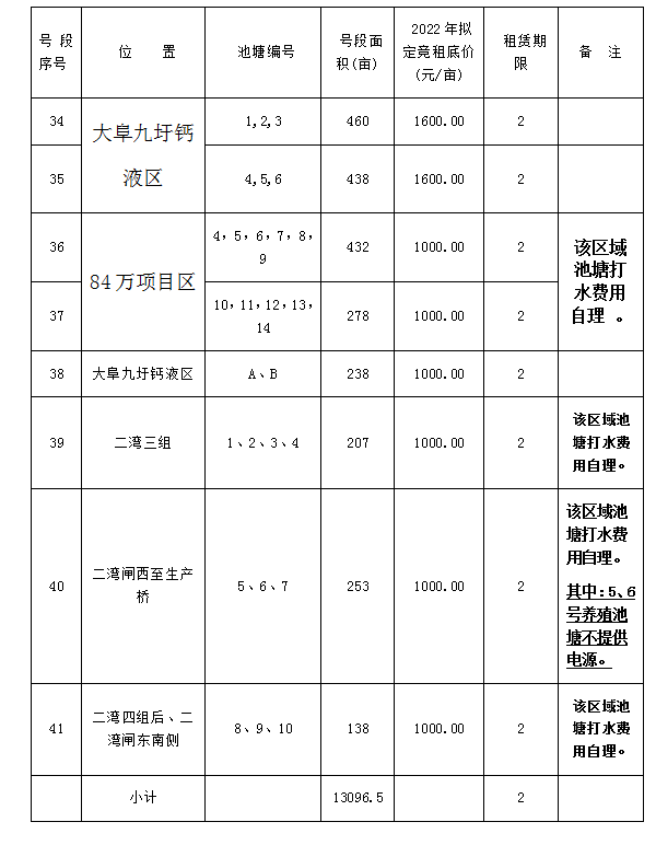 據連云港市工業投資集團有限公司關于資產租賃相關文件精神的要求及本公司淡水養殖池塘實際情況,經灌西投資公司池塘租賃領導小組研究,報請集團公司同意,2022年現對下述養殖池塘公開對外競租。