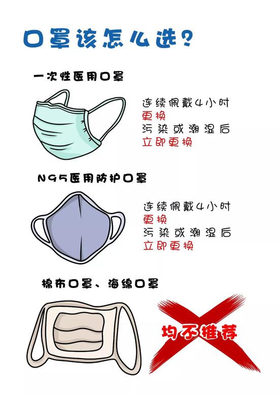 選擇二:去醫(yī)院看病或人群密集處可選用N95醫(yī)用防護(hù)口罩,連續(xù)佩戴4小時(shí)更換,污染或潮濕后立即更換。