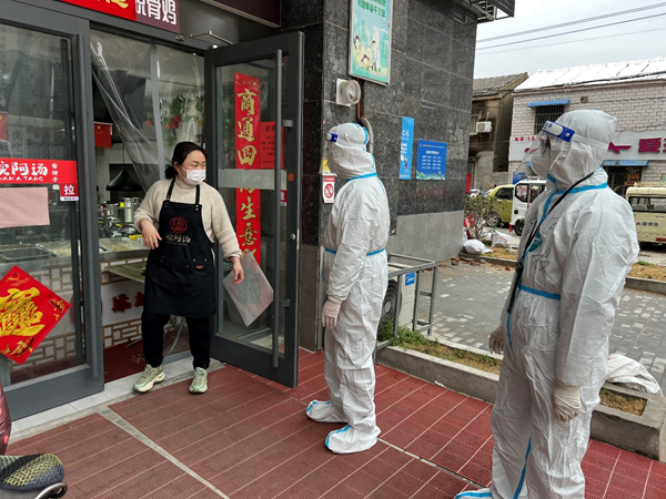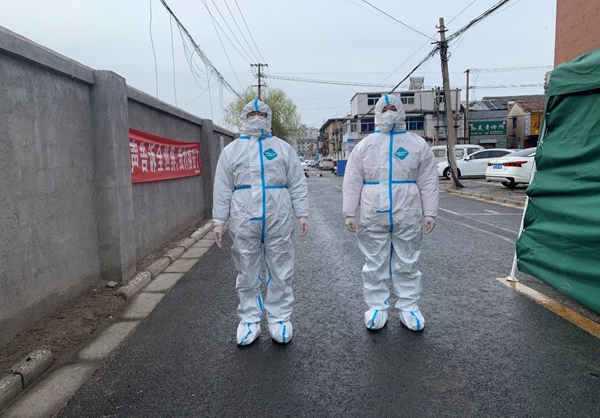 公司員工范益楊、李夢達是集團抗疫志愿隊的隊員。在冷冽寒風中,他倆身穿防護服挨家挨戶通知商戶暫停營業,同樣的通知話語不厭其煩的重復著一遍又一遍,說得口干舌燥、疲憊不堪也未能阻攔他們繼續前進的腳步。
