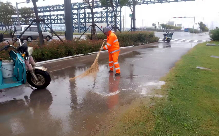 9月12日夜里,一場(chǎng)秋雨悄然降臨徐圩大地。為保障往來(lái)徐圩新城,石化園區(qū)車輛、行人道路整潔環(huán)境。保潔分公司全員上下齊心協(xié)力,無(wú)懼秋雨濕透衣衫,辛勤勞作場(chǎng)面呈現(xiàn)道路沿線。